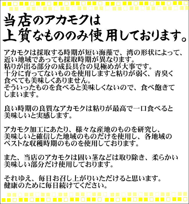 ※当地では4月下旬ごろから5月中旬ごろに採取したものを採れたその日のうちに加工し、冷凍処理をしています。(ワンフローズン) ※アカモクは生息場所によって、色に違いが出ますが、栄養面においては違いはございません。 |
