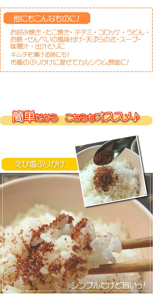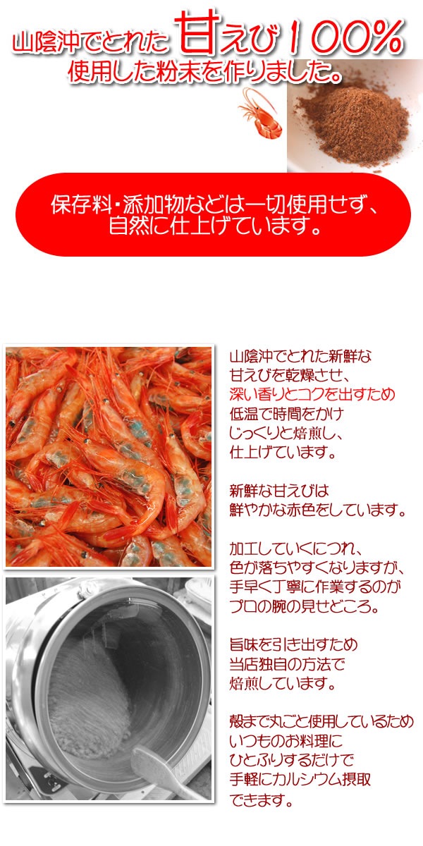 | 商品内容 | 兵庫県浜坂産 干しあまえび粉末 業務用1kg 原材料:甘えび |