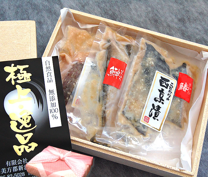 (送料無料)自家製!地魚の西京漬け 化粧箱入 風呂敷包み(冷凍)3種類×2切れ入[浜坂産](無添加)ギフト、お歳暮に