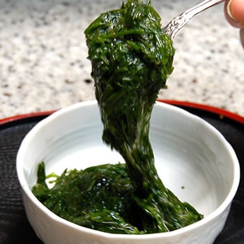アカモクはホンダワラ科の海藻で、春先の2~3週間ほどしかとれません。火を通すと褐色から鮮やかな緑にかわります。