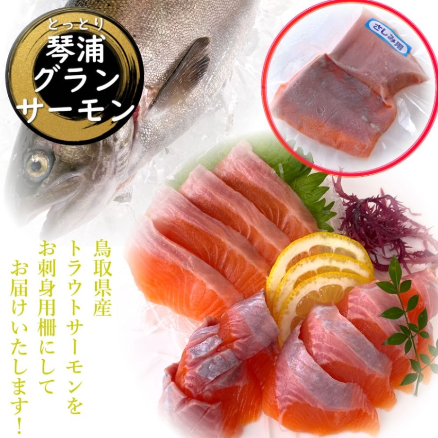 | 商品内容 | とっとり琴浦グランサーモンは、鳥取県の中部に位置する琴浦町で大山からの良質な地下水で育てられています。 養殖魚は、ワクチンや投薬をされるのが一般的ですが、この「とっとり琴浦グランサーモン」は、卵から成魚まで一貫して無投薬で育てられているので、安心してお召し上がりいただけます。 アニサキスの心配もありません。 この「とっとり琴浦グランサーモン」を1回で食べきれる量のパックにしてお届けいたします。 当店で捌いた後、すぐに高品質凍結を可能にした3Dフリーザーで急速冷凍してあります。 〇とっとり琴浦グランサーモン・お刺身用柵(冷凍・養殖トラウト) 約120-129g入×3パック【鳥取県産】 〇とっとり琴浦グランサーモンのいくら醤油漬け 25g×1 ※刺身は小骨を取り除いておりますが、まれに小骨が残っている場合がございますので、ご注意願います。 ※いくらは時期により、粒の大きさが異なり、直径2mmほどの小さないくらの時期のものもあります 【高鮮度3Dフリーザー凍結】・・・食品の解凍時に、細胞を破壊しないため、解凍の際ドリップがでにくく、 旨味が流れ出ないのが特長の急速冷凍です。 食材の劣化が少なく、鮮度や風味・品質はそのまま維持できる点で優れています。 |